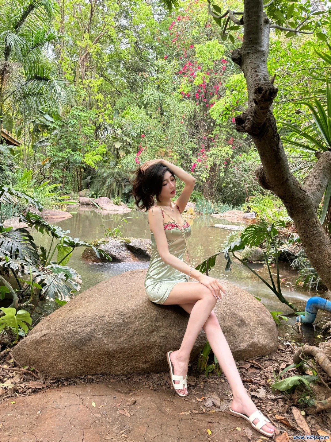 踏入这片绿意盎然的森林时,我的心便被深深眩惑住了。高耸的热带植物在阳光下熠熠生辉,树荫之间的小路周折弯曲,仿佛通向未知的秘境。我走到一块高大的岩石前,坐下相通热诚,感受死后小溪的潺潺水声。这块石头有些大约,却显得耐心而稳固。我伸手轻抚身边的绿植,仿佛与它们交换了一种无声的致意。背后的红色花丛点缀在这片绿色海洋中,清秀而不突兀,像是一幅画顶尽心留白的点缀。咫尺的快意好意思得不委果,让我忍不住摆好姿势,用镜头记载下这一刻。